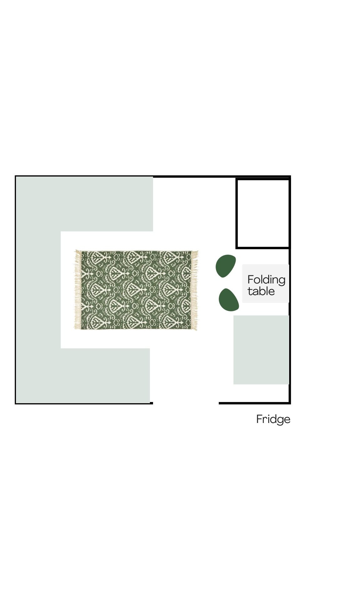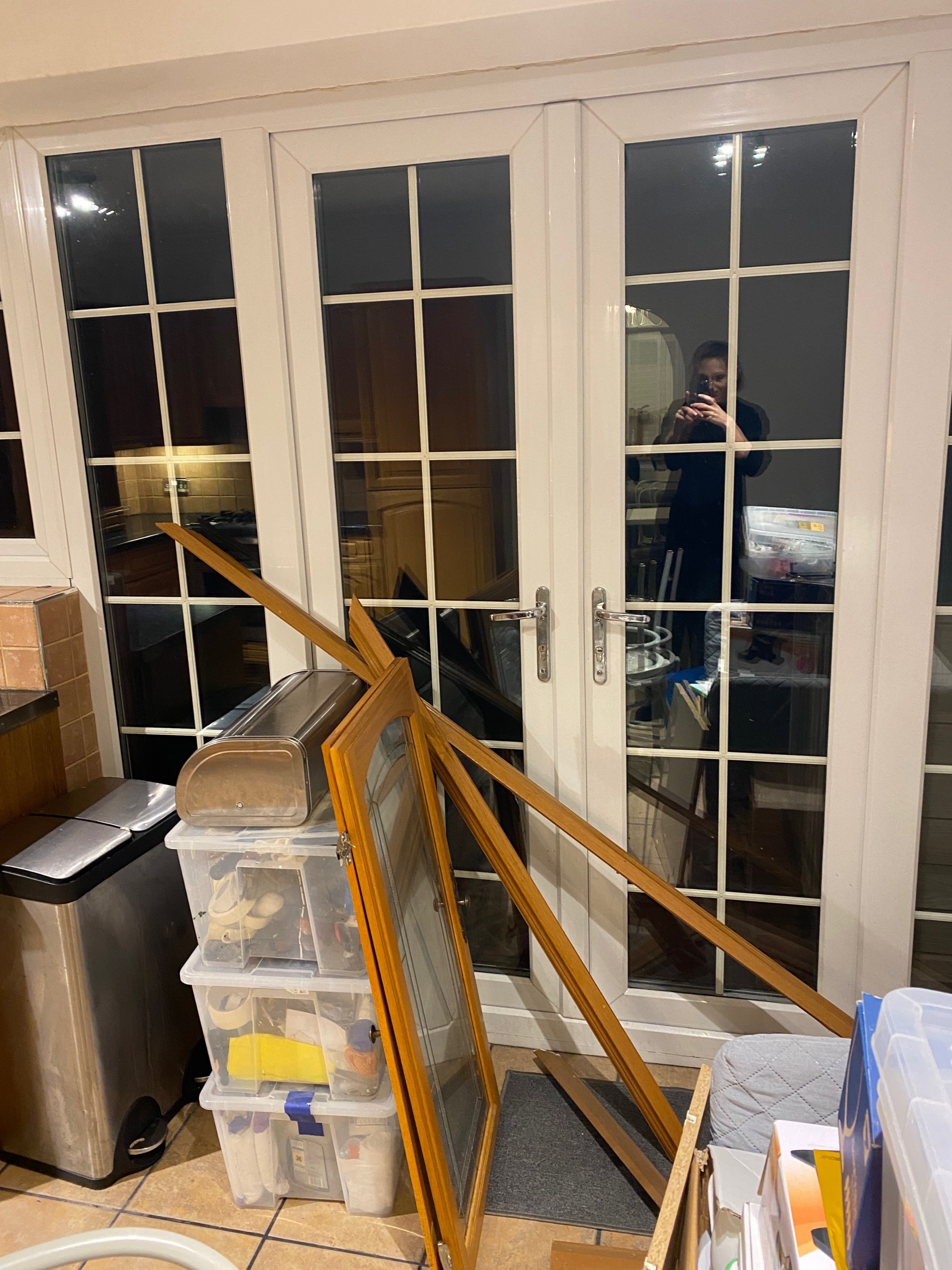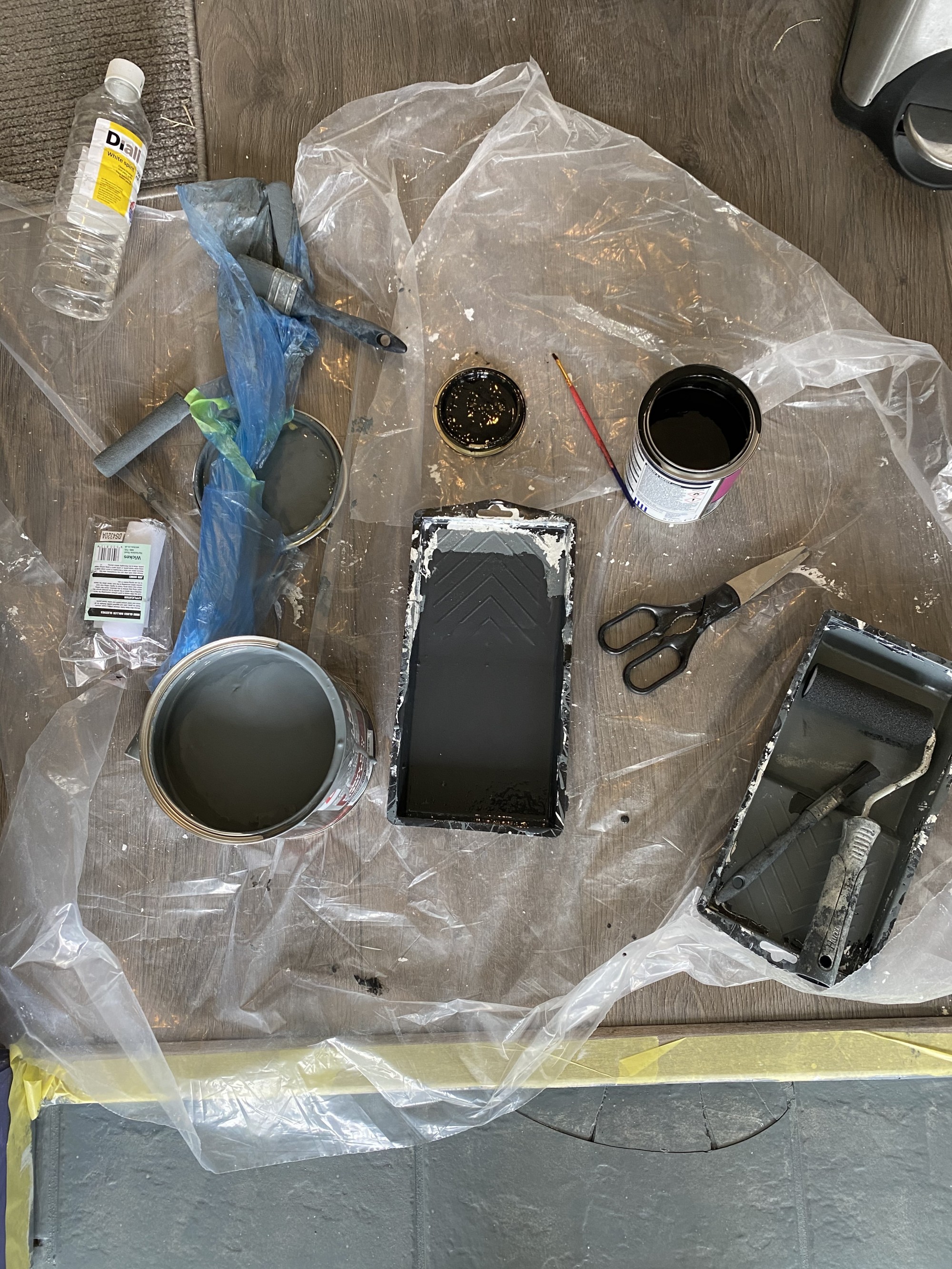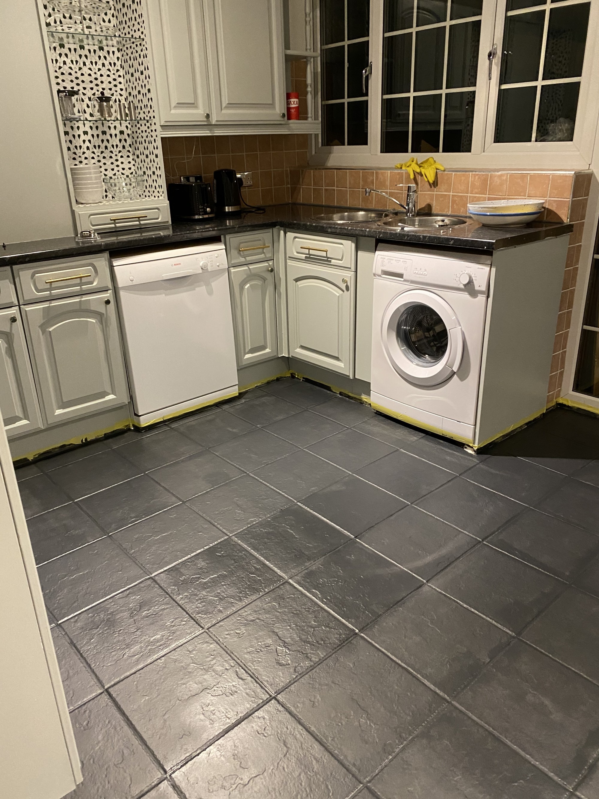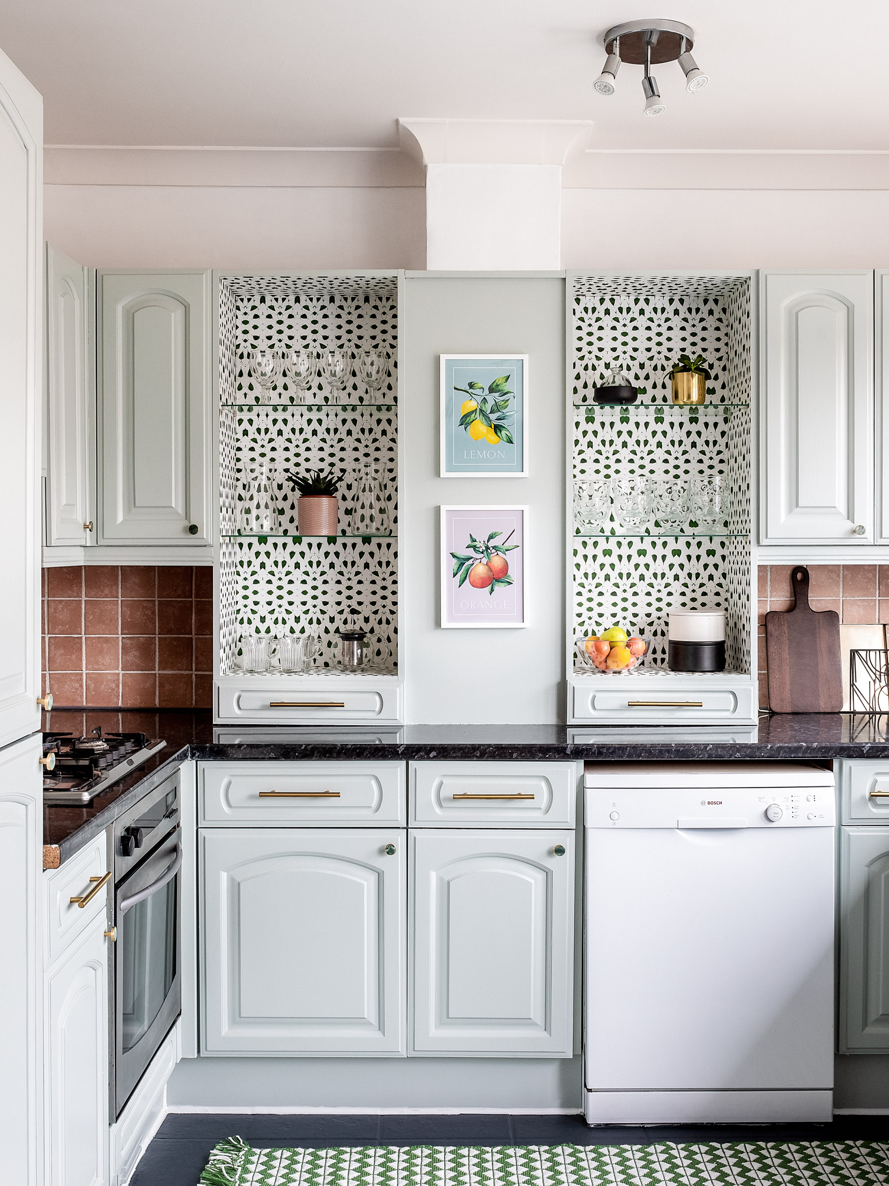 The original kitchen was made of wooden cabinet doors and brown veneer carcasses with a cornice at the top of the cabinets. It also had ornamental brass handles from the 90s (or older?), old-fashioned glass doors, brownish grout on the backsplash, and yellow floor tiles. We invested a whole lot of time to turn it into a modern and friendly kitchen with sage green cabinets, brass handles, and a charcoal-painted tile floor using nothing but paint (and a whole lot of perseverance). The crown jewel of the new kitchen was the wallpaper by Ottoline De Vries on the inside of the cabinets that had previously been hidden behind the tinted glass door.