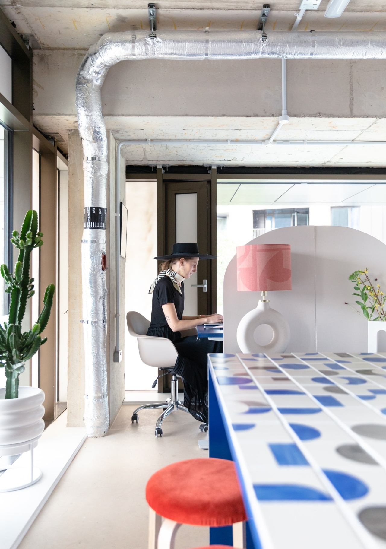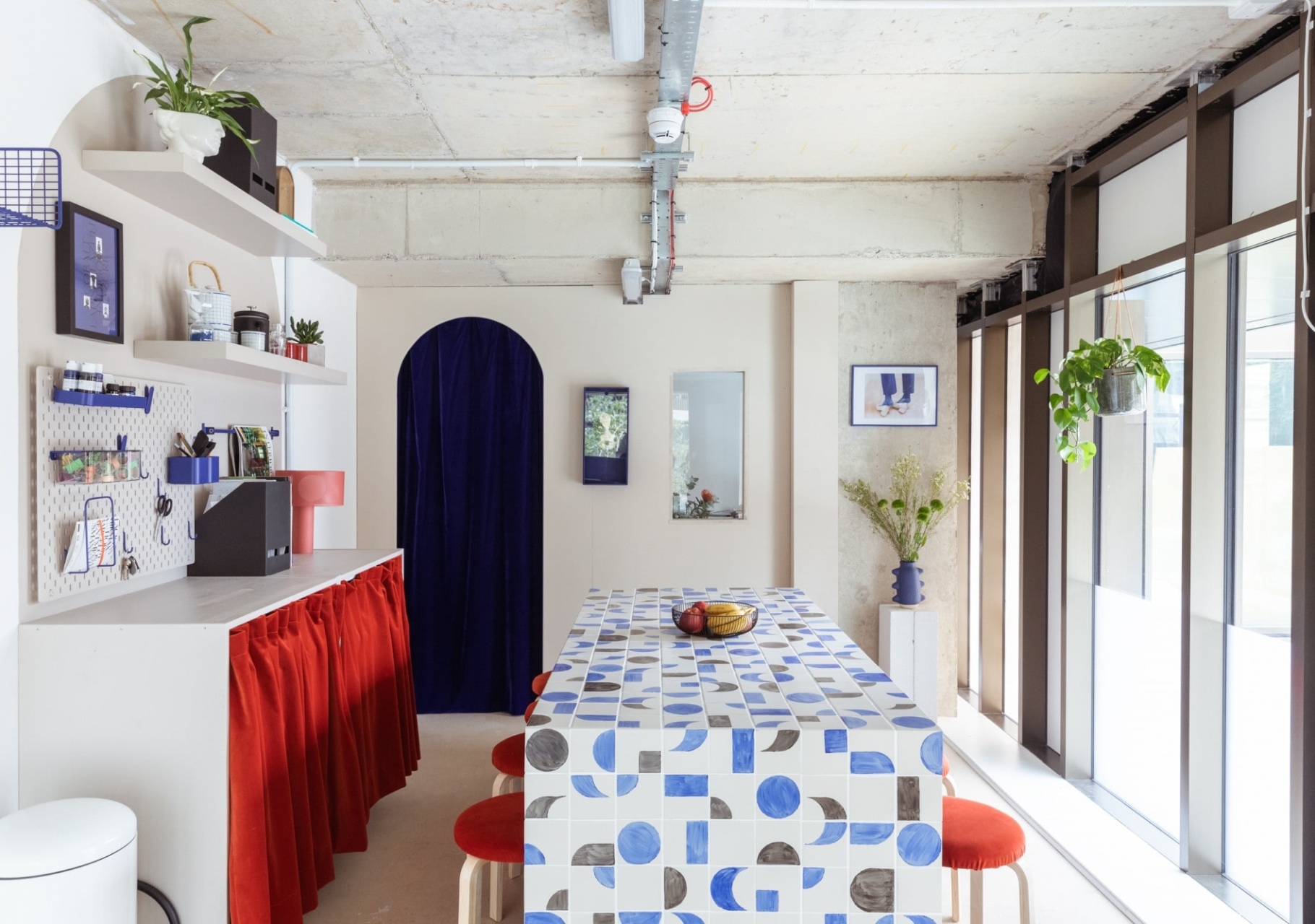 In my opinion, the highlight of this space is the custom-made table, for which I hand-painted over 400 tiles in a pattern we created based on our logo. I’m planning a whole series of articles to take you through the separate steps of the DIY process.