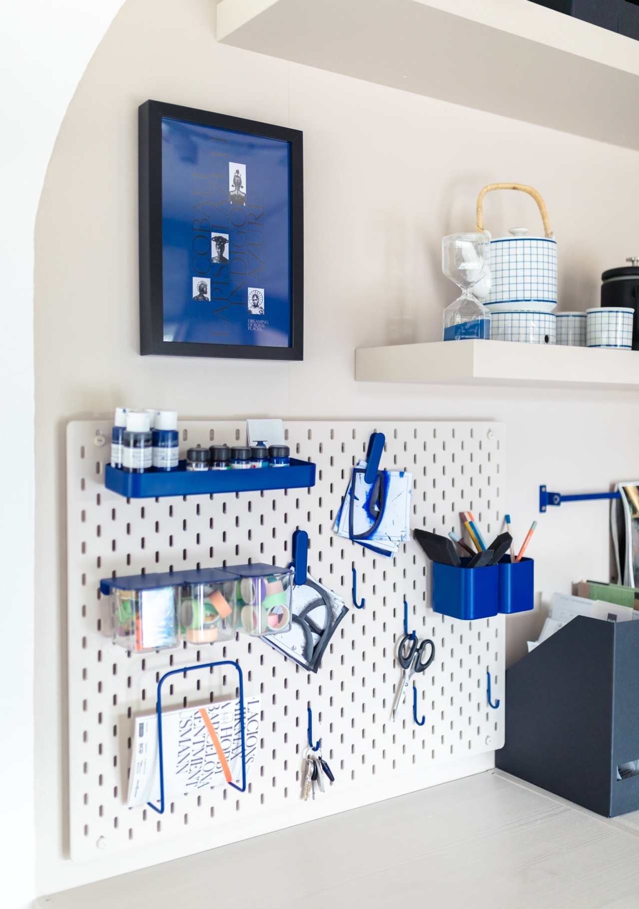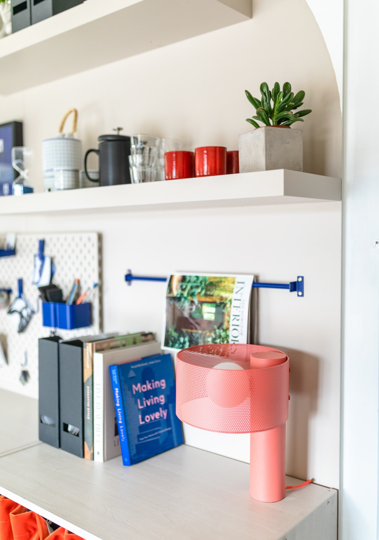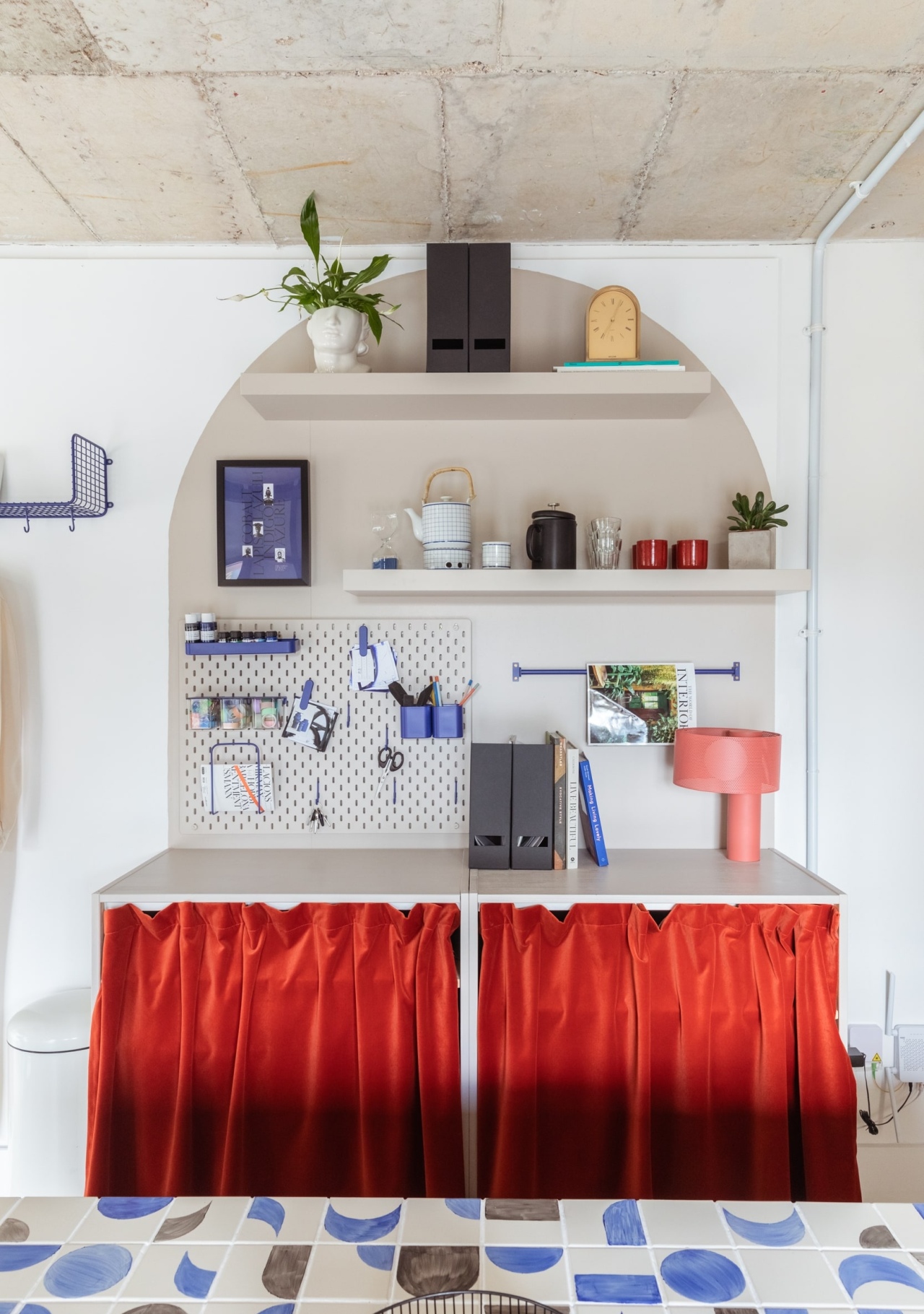 The final change to the design that we made was with regards to the storage system. While I would have preferred our original idea of constructing customised arched cabinets, the fact that we were only renting this space made us think twice over whether we wanted to spend this much money on custom designed furniture. Instead, we opted for a creative compromise in which I combined Ikea’s Ivar cabinets with arched cabinet legs from Pretty Pegs and used paint to create an arched background that we accessorised with shelves and office equipment from Ikea. Keep an eye out on my Instagram @atelierakuko for a mini-DIY on this!