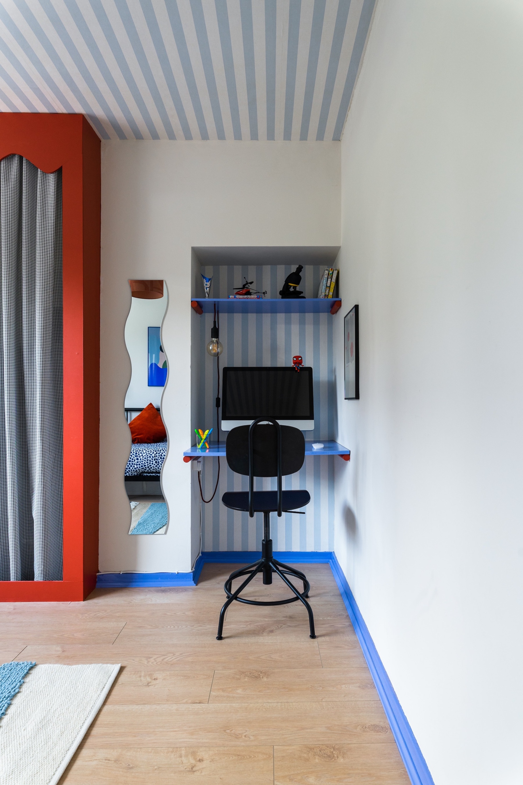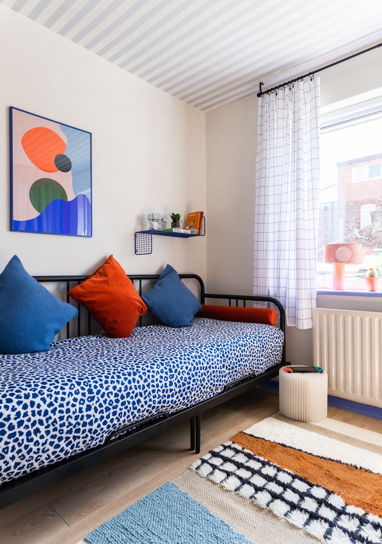 Harry had requested the use of his favourite colours, blue and red, in the room. He wanted it to reflect his main interests, Marvel and Star Wars, and be spacious enough for his favourite activities: gaming, reading, TikTok and Lego. My aim was to create a space that he would be able to grow with, playfully embracing his still childlike spirit yet sophisticated enough to be suitable for his later years as a teenager.