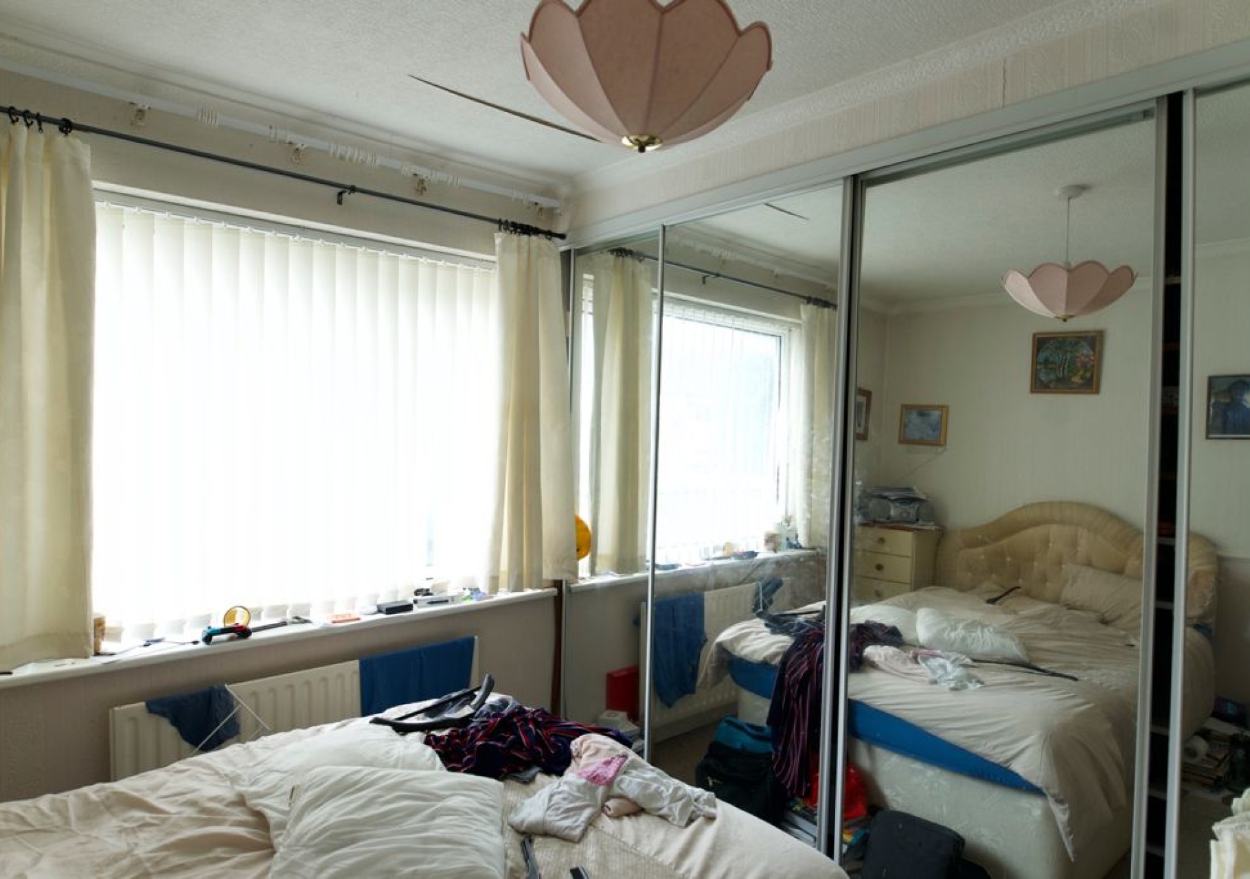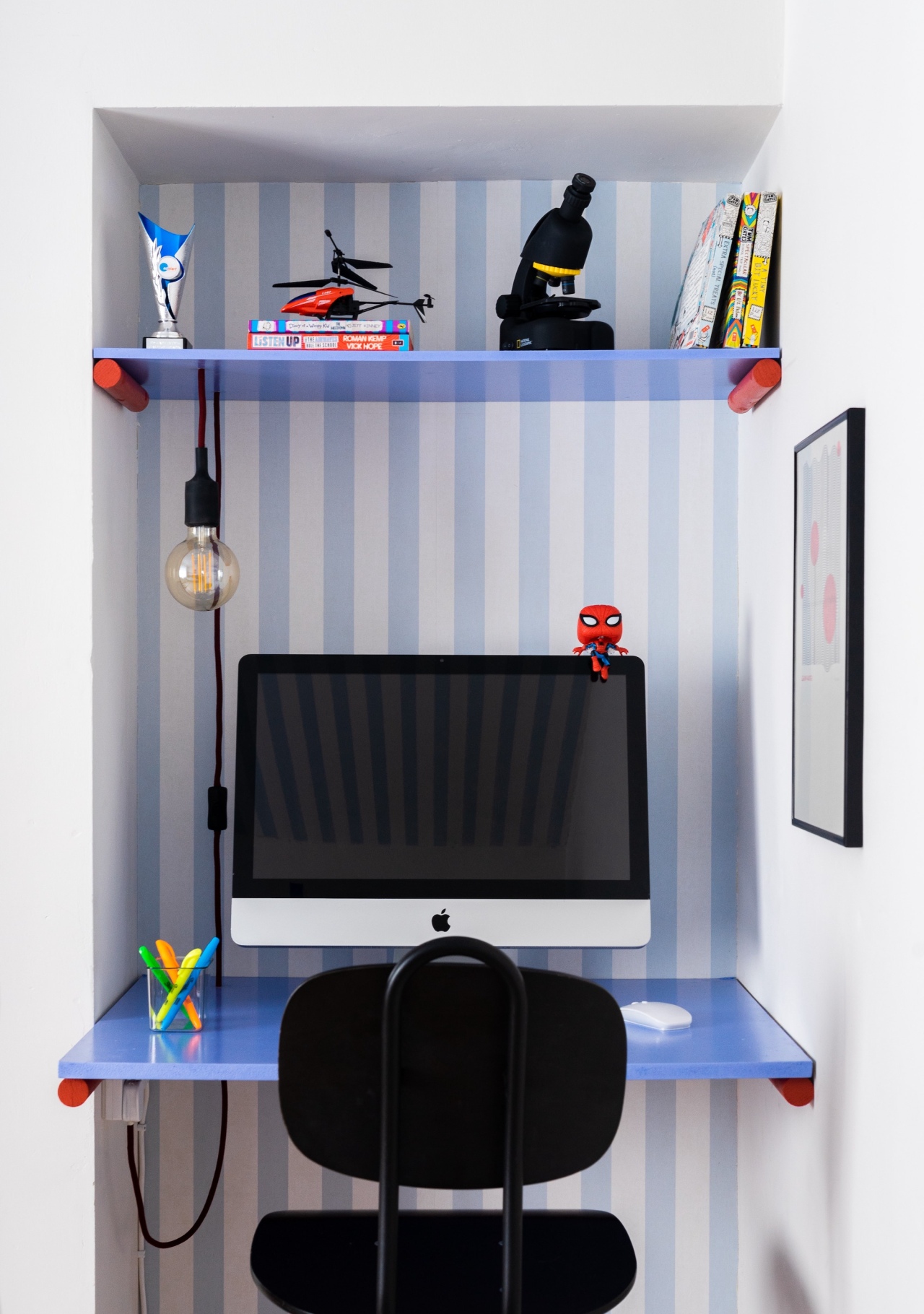 After removing the wallpaper and original built in, we cleaned and fixed the walls before painting them with Crowns Paint Matt Emulsion in Fine Silk. We used Crowns Paint Glossy Wood Paint in the colour Periwinkle on the skirting board, installed new vinyl wooden floors and installed striped wallpaper to the ceiling and in the alcove to optically lengthen the rather small room. We also used MDF and dowels from B&Q to make a built in desk and shelf for the Alcove, which included a custom task light.