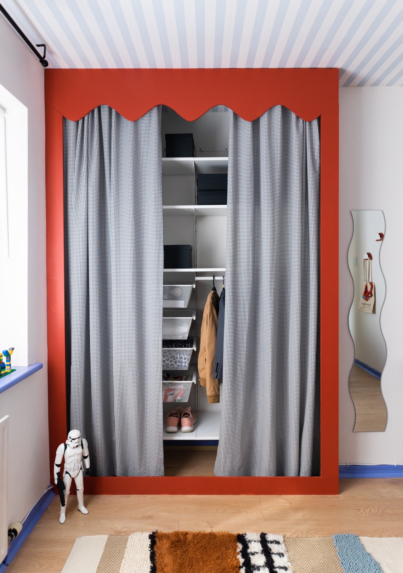 The frame for the built-in wardrobe was inspired by one I had seen in the dressing room of 2LG Studio. As our budget was limited, we needed an option that we would be able to build ourselves at minimal cost. We paired the external structure with Ikea's customisable wall shelving system BOAXEL.