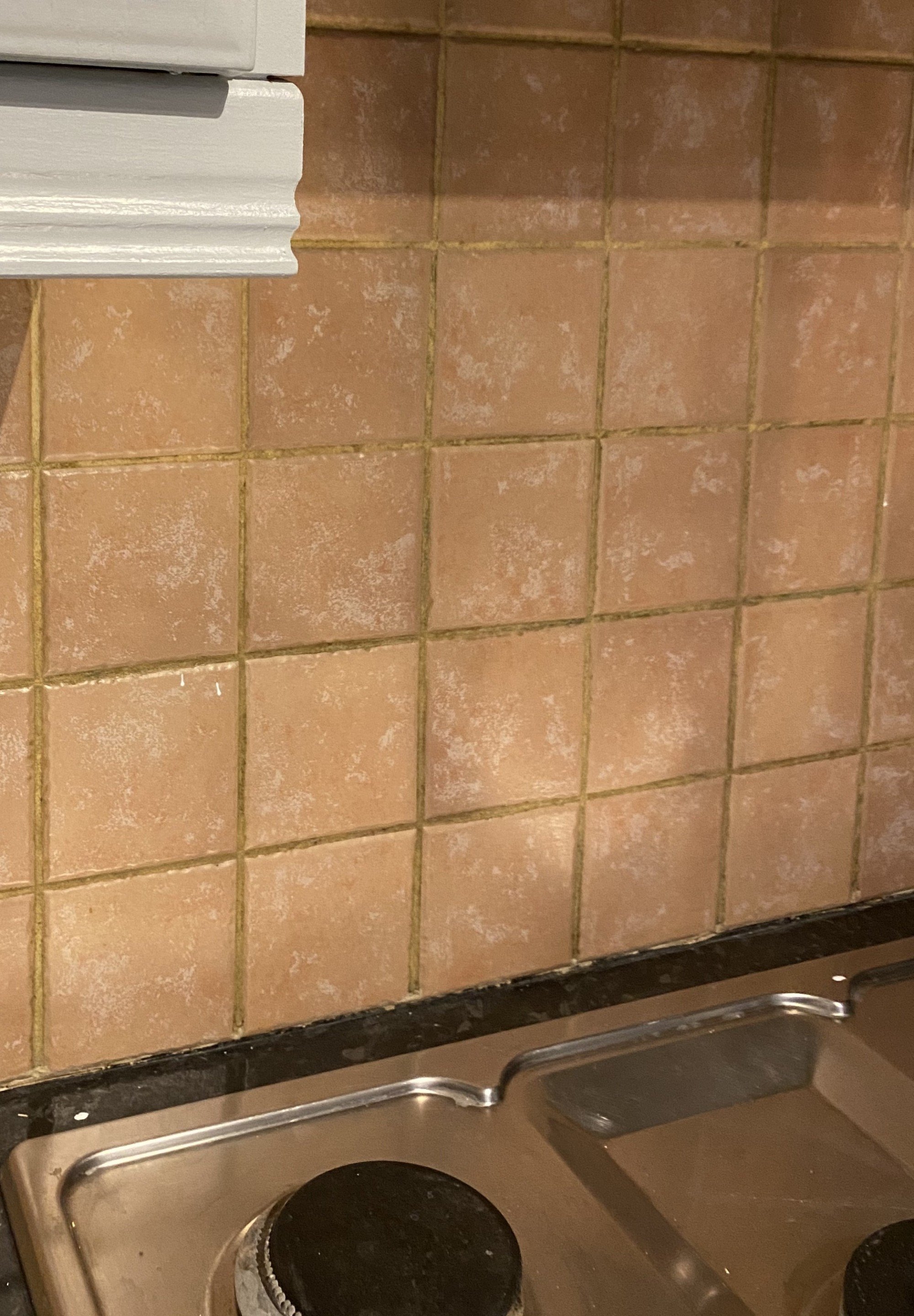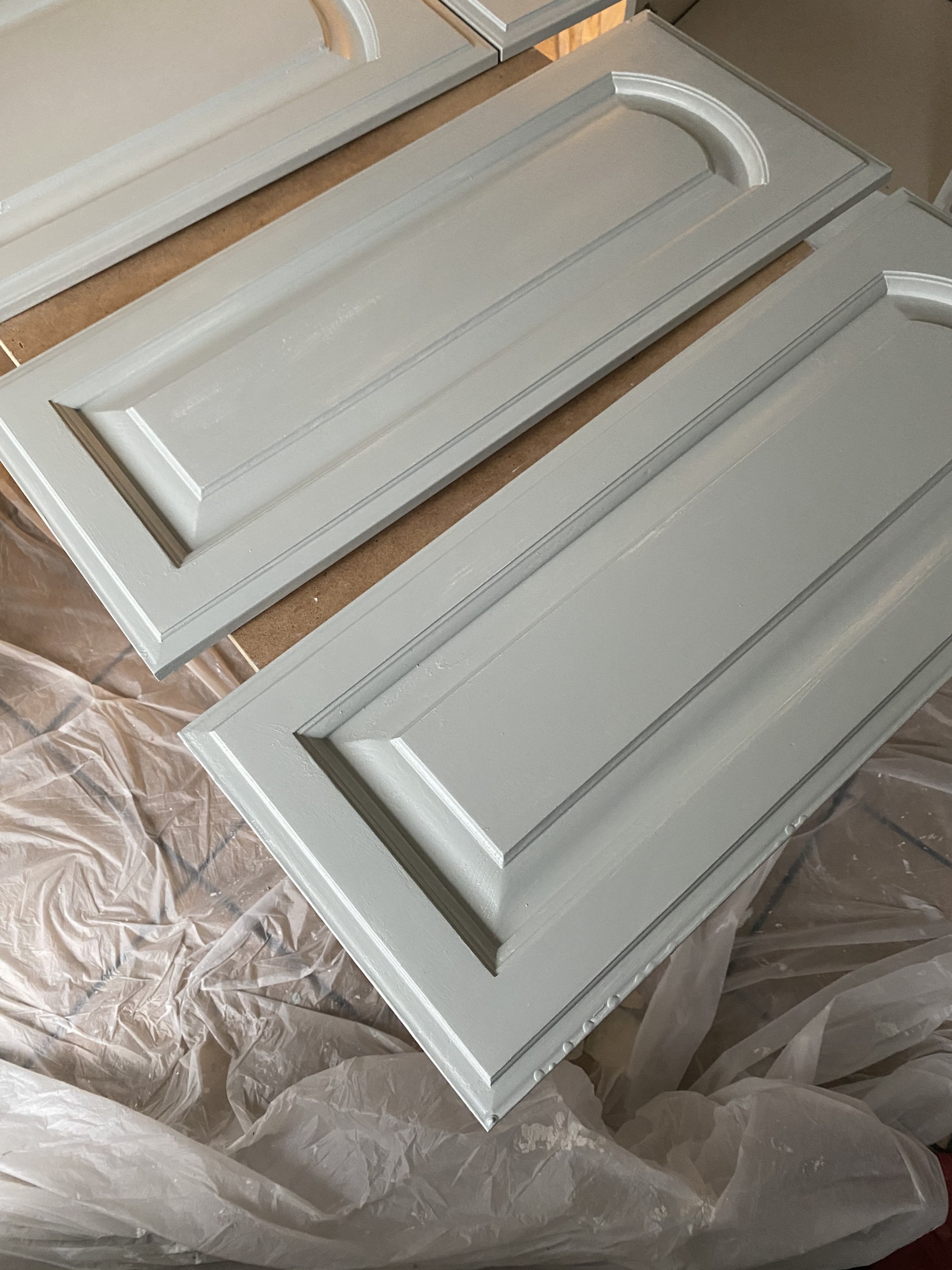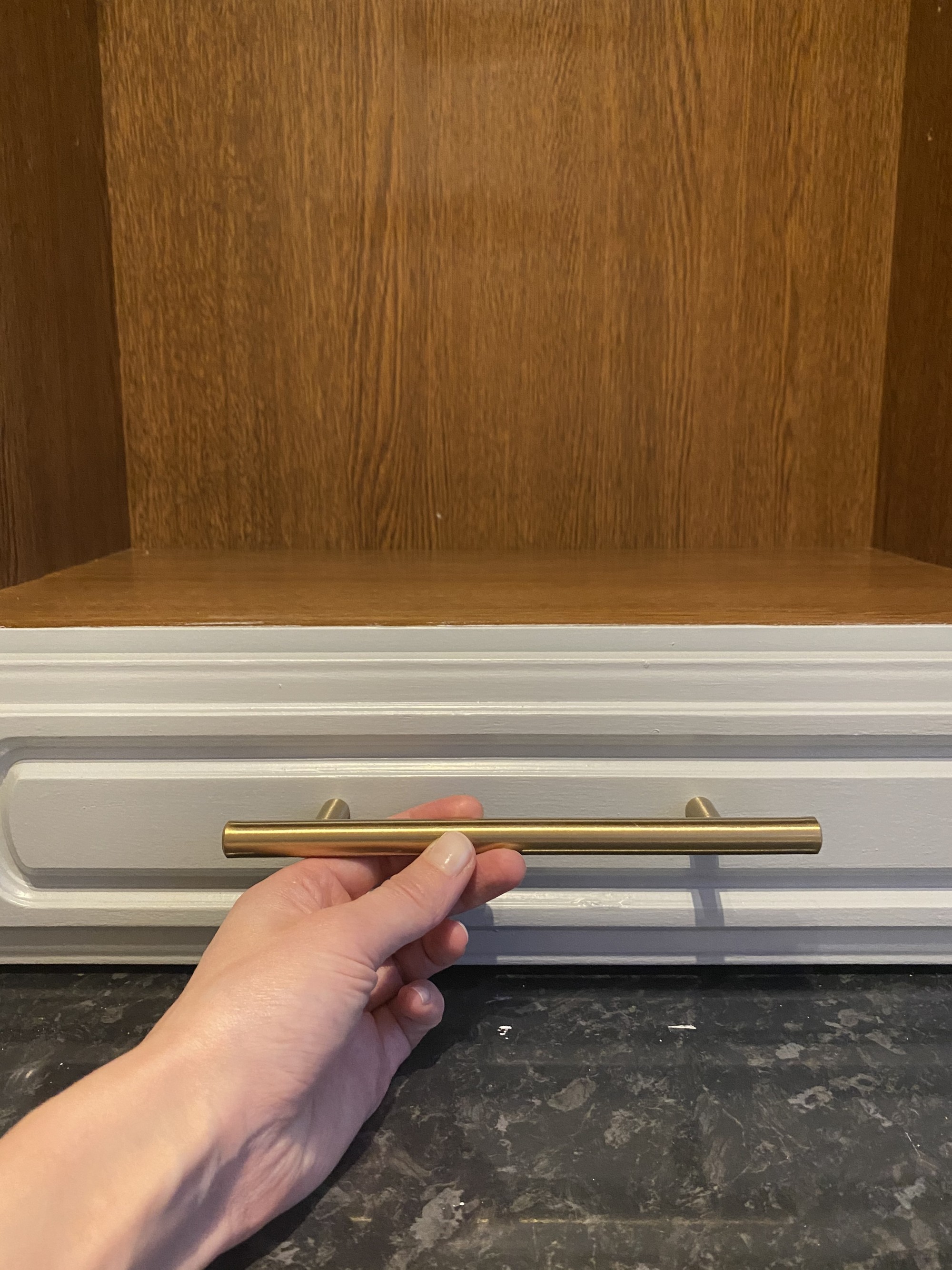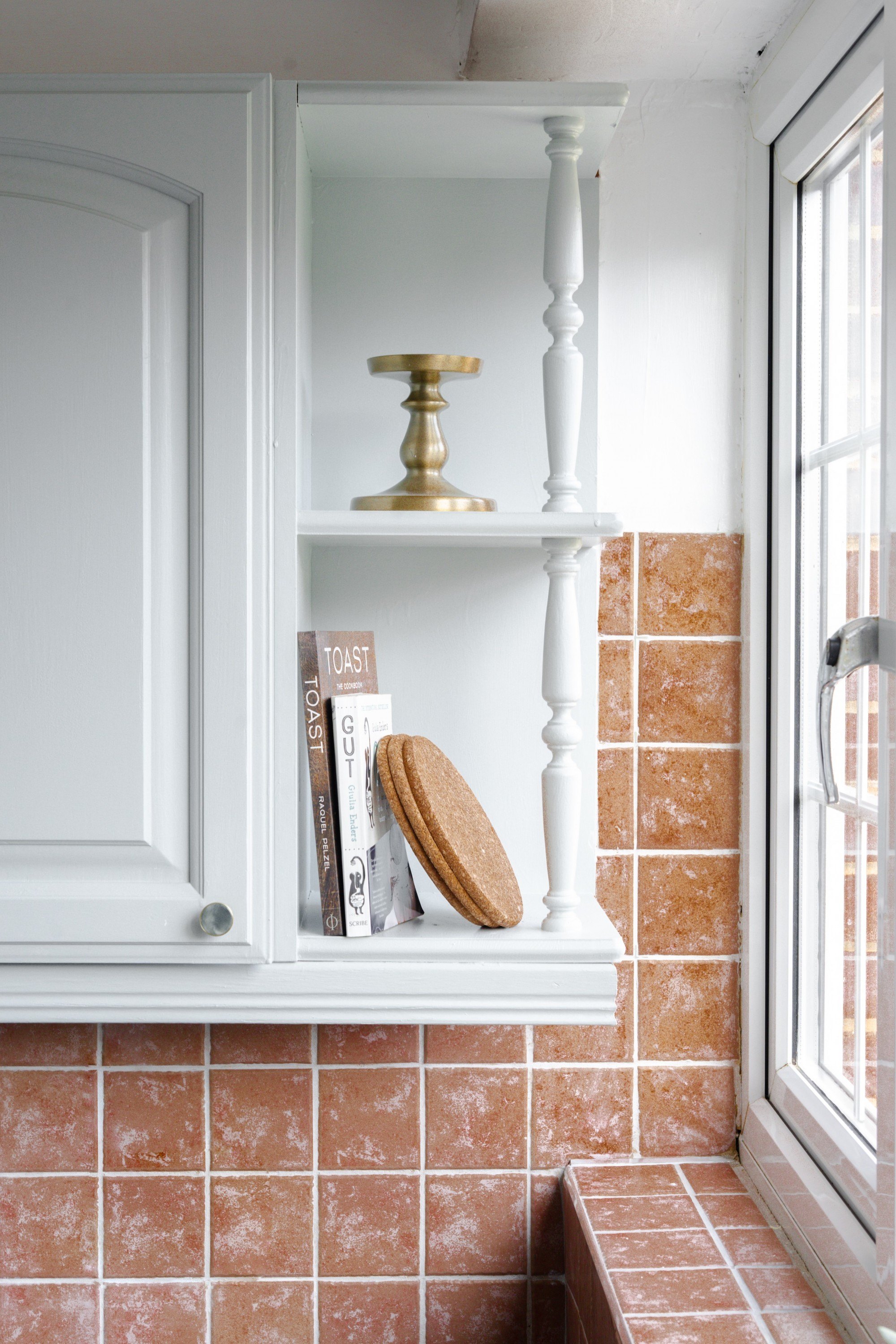 The original kitchen was made of wooden cabinet doors and brown veneer carcasses with a cornice at the top of the cabinets. It also had ornamental brass handles from the 90s (or older?), old-fashioned glass doors, brownish grout on the backsplash, and yellow floor tiles. We invested a whole lot of time to turn it into a modern and friendly kitchen with sage green cabinets, brass handles, and a charcoal-painted tile floor using nothing but paint (and a whole lot of perseverance). The crown jewel of the new kitchen was the wallpaper by Ottoline De Vries on the inside of the cabinets that had previously been hidden behind the tinted glass door.