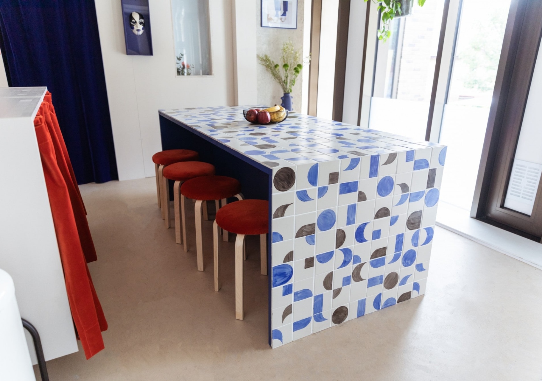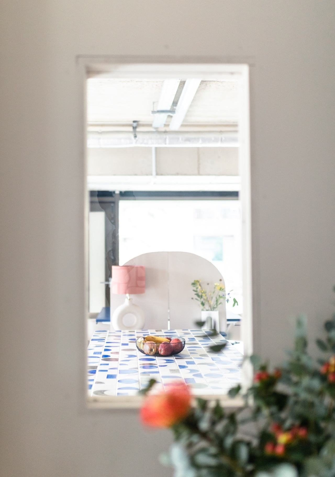 In my opinion, the highlight of this space is the custom-made table, for which I hand-painted over 400 tiles in a pattern we created based on our logo. I’m planning a whole series of articles to take you through the separate steps of the DIY process.