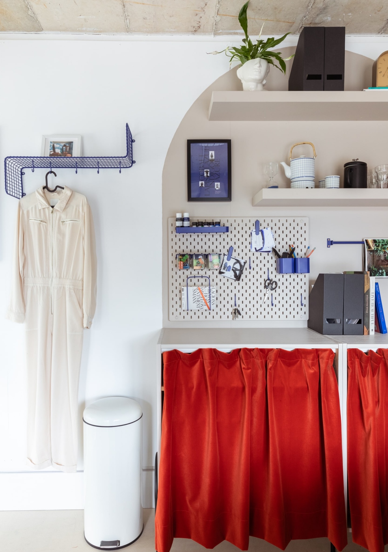 The final change to the design that we made was with regards to the storage system. While I would have preferred our original idea of constructing customised arched cabinets, the fact that we were only renting this space made us think twice over whether we wanted to spend this much money on custom designed furniture. Instead, we opted for a creative compromise in which I combined Ikea’s Ivar cabinets with arched cabinet legs from Pretty Pegs and used paint to create an arched background that we accessorised with shelves and office equipment from Ikea. Keep an eye out on my Instagram @atelierakuko for a mini-DIY on this!