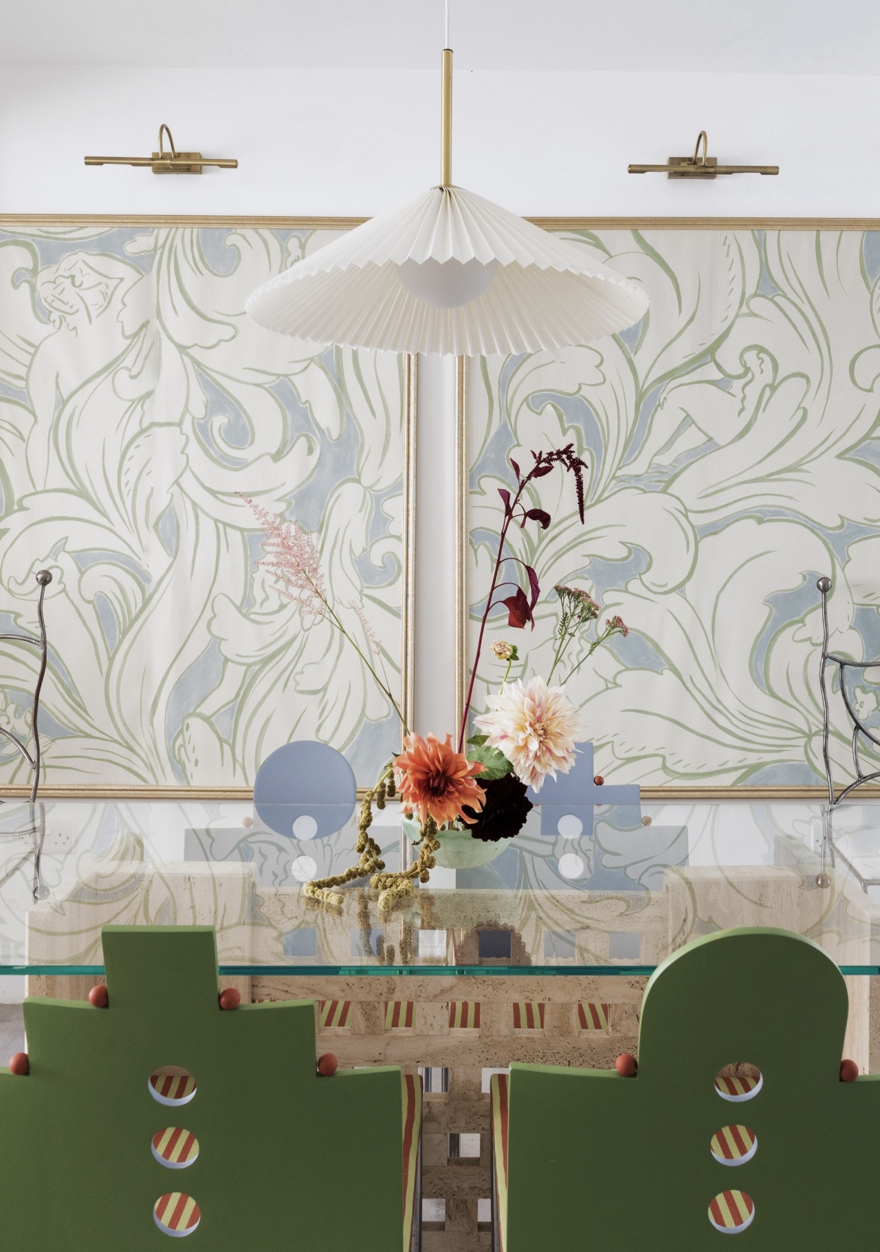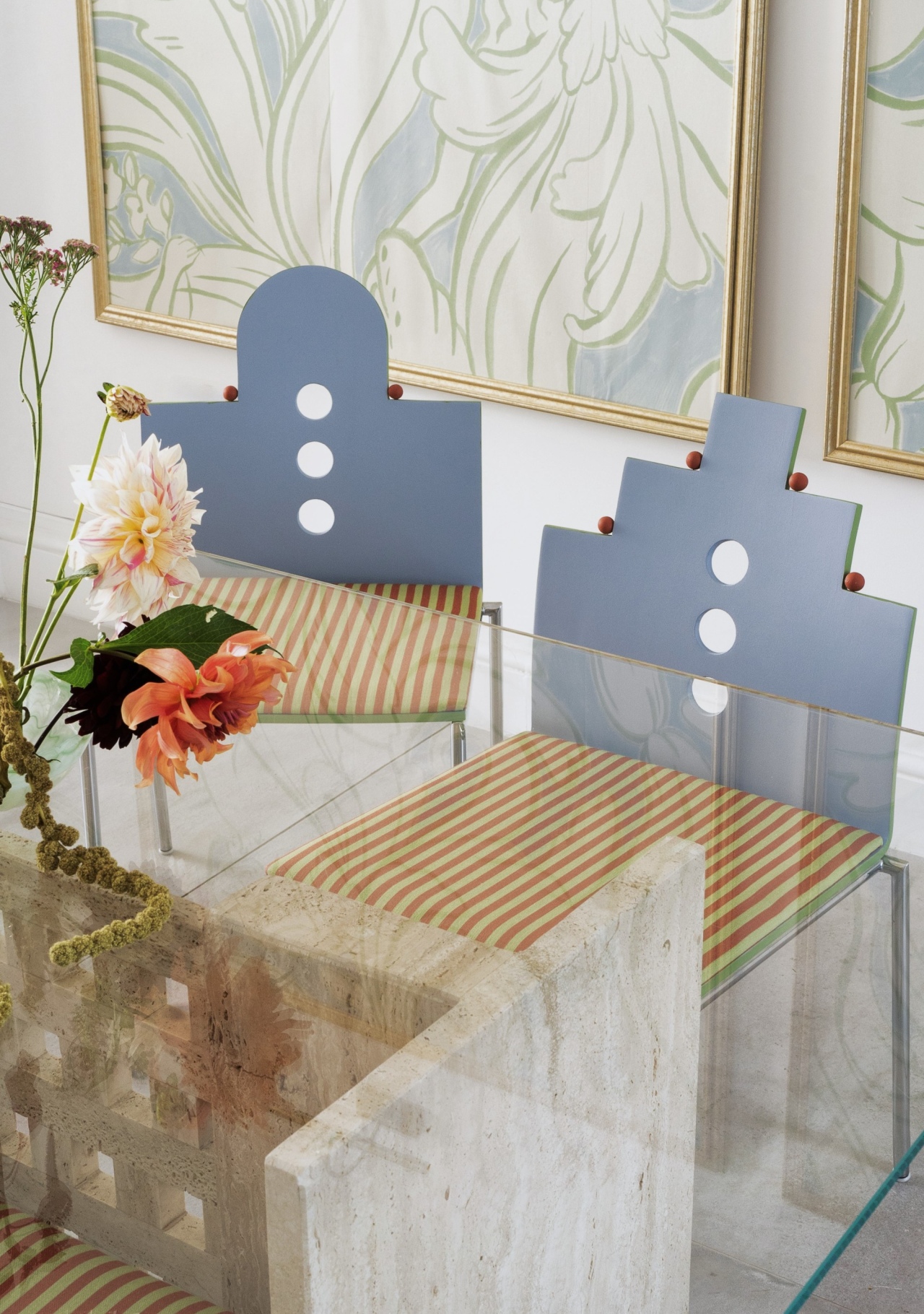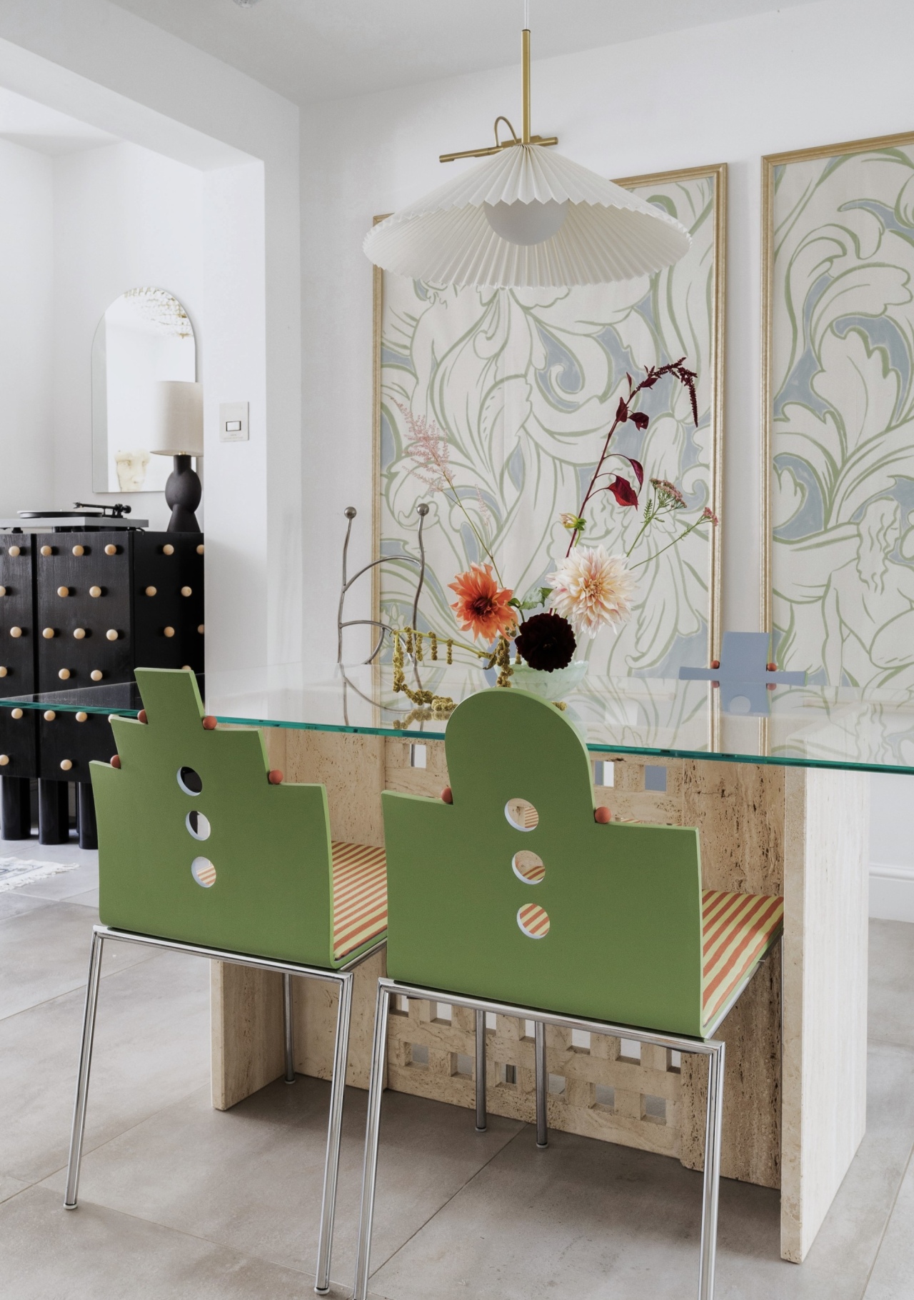 Embark on a tour of this Brighton dining sanctuary and featuring a Brutalist travertine dining table within a budget-friendly design scheme. In a recent article about this space that was published in Domino magazine, I offer valuable insights from my design journey creating this space: from acquiring affordable stone tables to executing DIY chair transformations using bespoke Colours of Arley upholstery and crafting budget-conscious art statements with Belarte mural wallpaper. Dive into the details of our thrifty design journey: What Started as ’90s Conference Room Chairs Are Now My Dining Room’s Conversation Starter