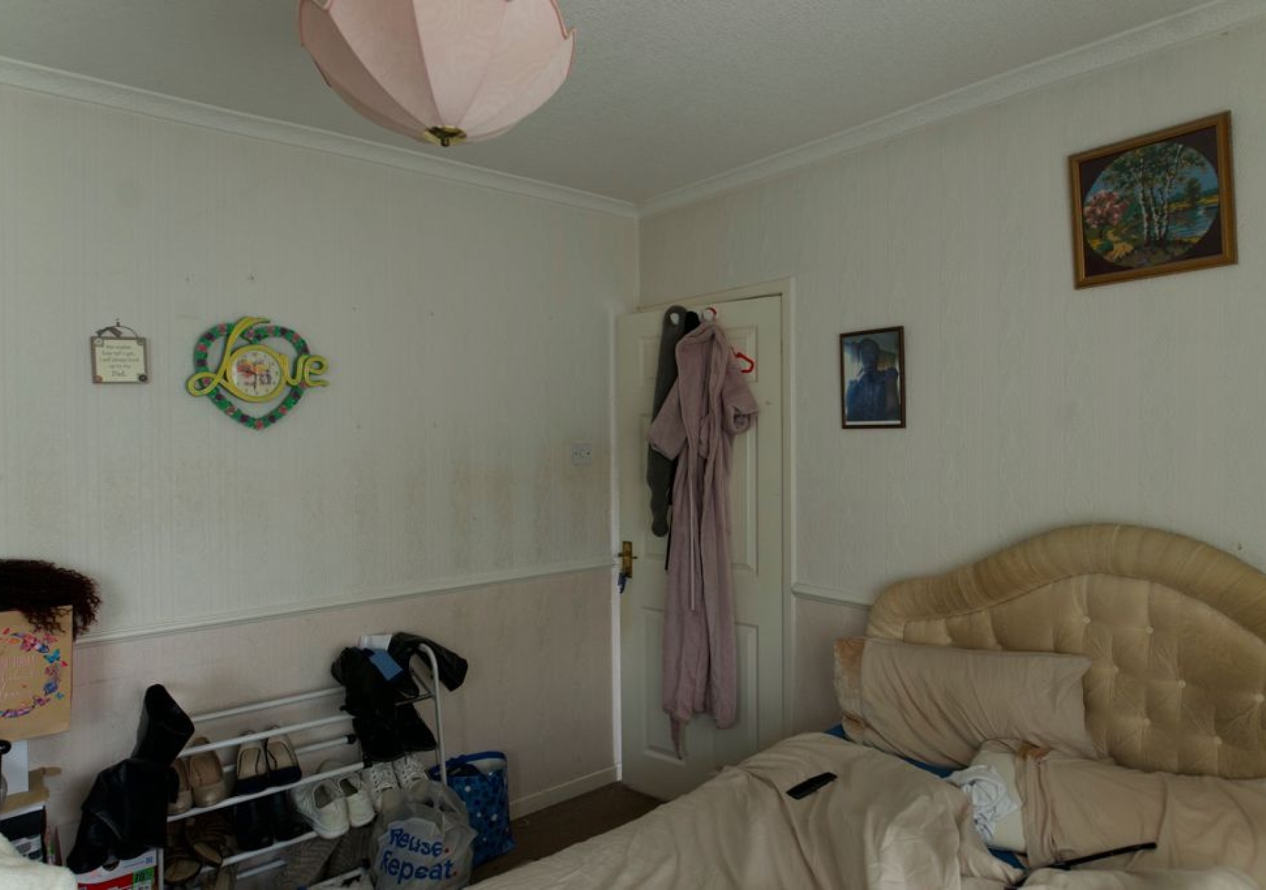 After removing the wallpaper and original built in, we cleaned and fixed the walls before painting them with Crowns Paint Matt Emulsion in Fine Silk. We used Crowns Paint Glossy Wood Paint in the colour Periwinkle on the skirting board, installed new vinyl wooden floors and installed striped wallpaper to the ceiling and in the alcove to optically lengthen the rather small room. We also used MDF and dowels from B&Q to make a built in desk and shelf for the Alcove, which included a custom task light.