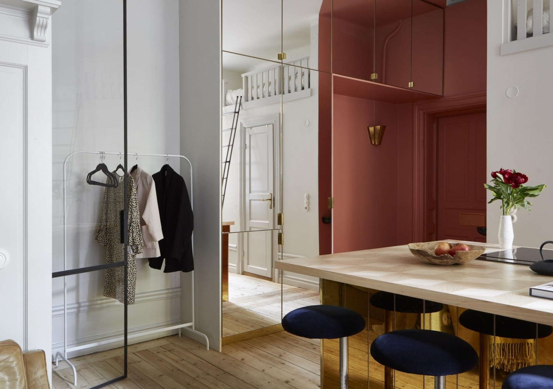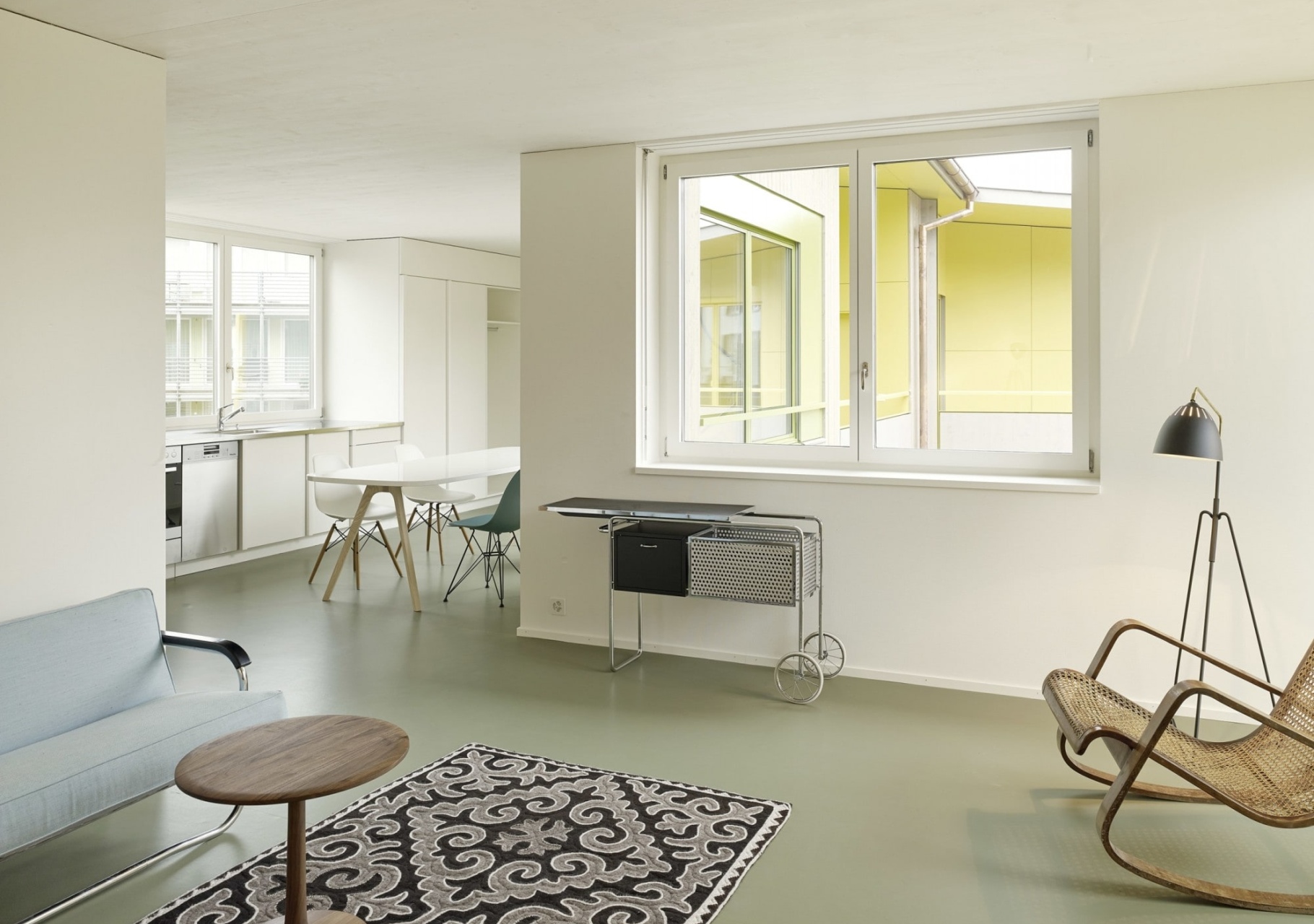Parts of another room can be annexed by using the same floor to connect the two rooms. This is especially effective if the annexed room has a window and therefore increases the overall perception of light in the space.